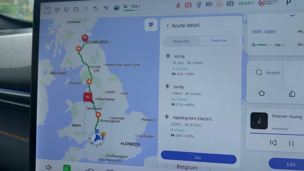 The software on the infotainment screen itself is excellent, with no stuttering or lag visible. For anyone that’s been in a recent Tesla, it’ll feel like a pretty familiar experience. Apple CarPlay and Android Auto are supported if you want to use apps such as Waze, but the EV charging discovery available on the built-in navigation is worth considering. If you plot a route further than the car’s battery range, the car will give you multiple options for stopping and charging on the way.