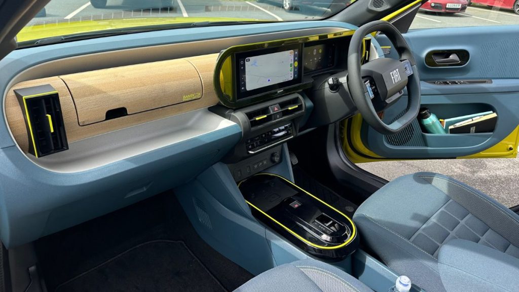 When it comes to the interior design, the Fiat Grande Panda also impresses. Some controls and switchgear will feel familiar to anyone who’s recently driven another Stellantis EV, but the cabin has plenty of personality of its own, including swathes of blue along with subtle yellow accents. The bamboo-based glovebox, which comes standard on ‘La Prima’ trim, brings even more character to the interior, while reinforcing the car’s eco credentials.