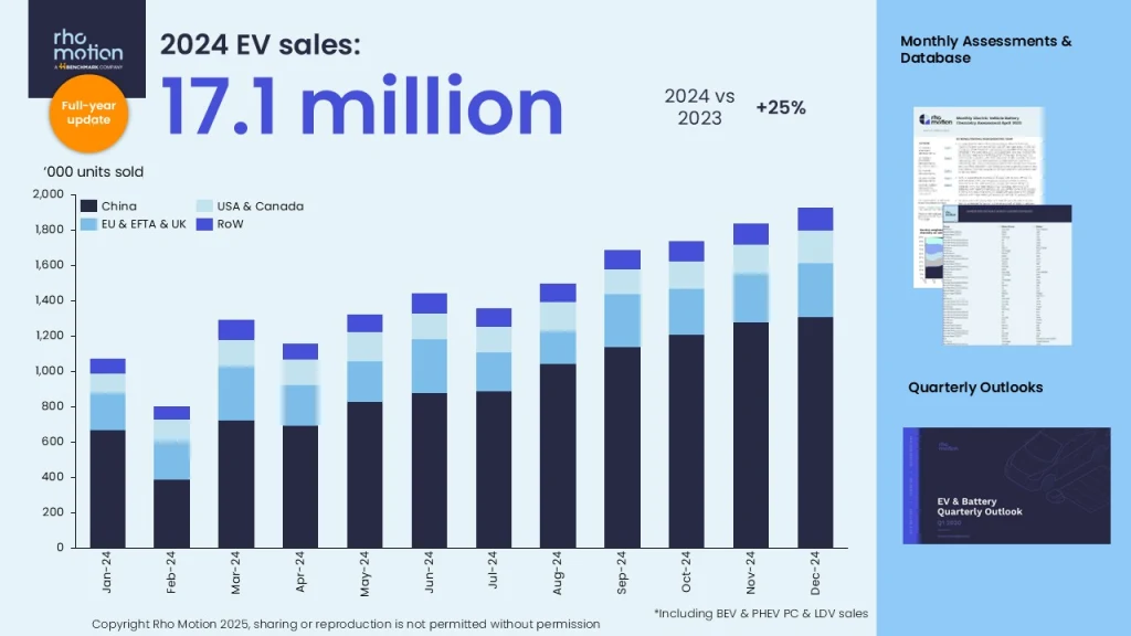 According to Rho Motion’s latest findings, 2024 was a landmark year for electric vehicles (EVs), with global sales soaring to 17.1 million units. This represents a 25% increase compared to 2023. December alone saw over 1.9 million EVs sold, setting a new monthly sales record.