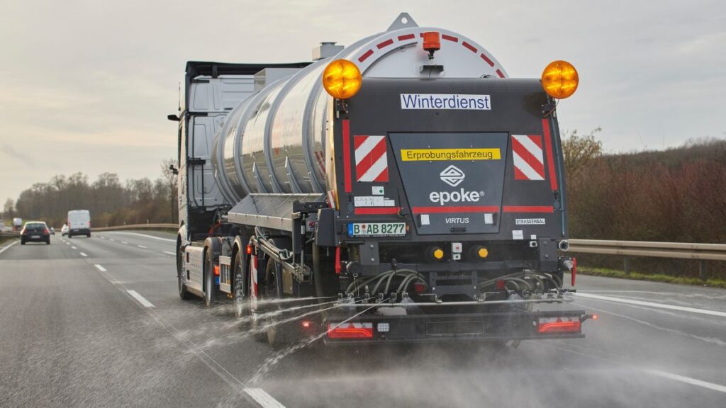 Facing the challenge of icy conditions, Autobahn GmbH sought an environmentally conscious alternative to traditional road salt. They opted for a brine solution made of water and salt. The semitrailer, operated independently from the truck’s tractor unit, efficiently spread the brine at a speed of 80 km/h, covering a width of 12 metres. Wireless control via a radio remote system allowed this precise spreading.